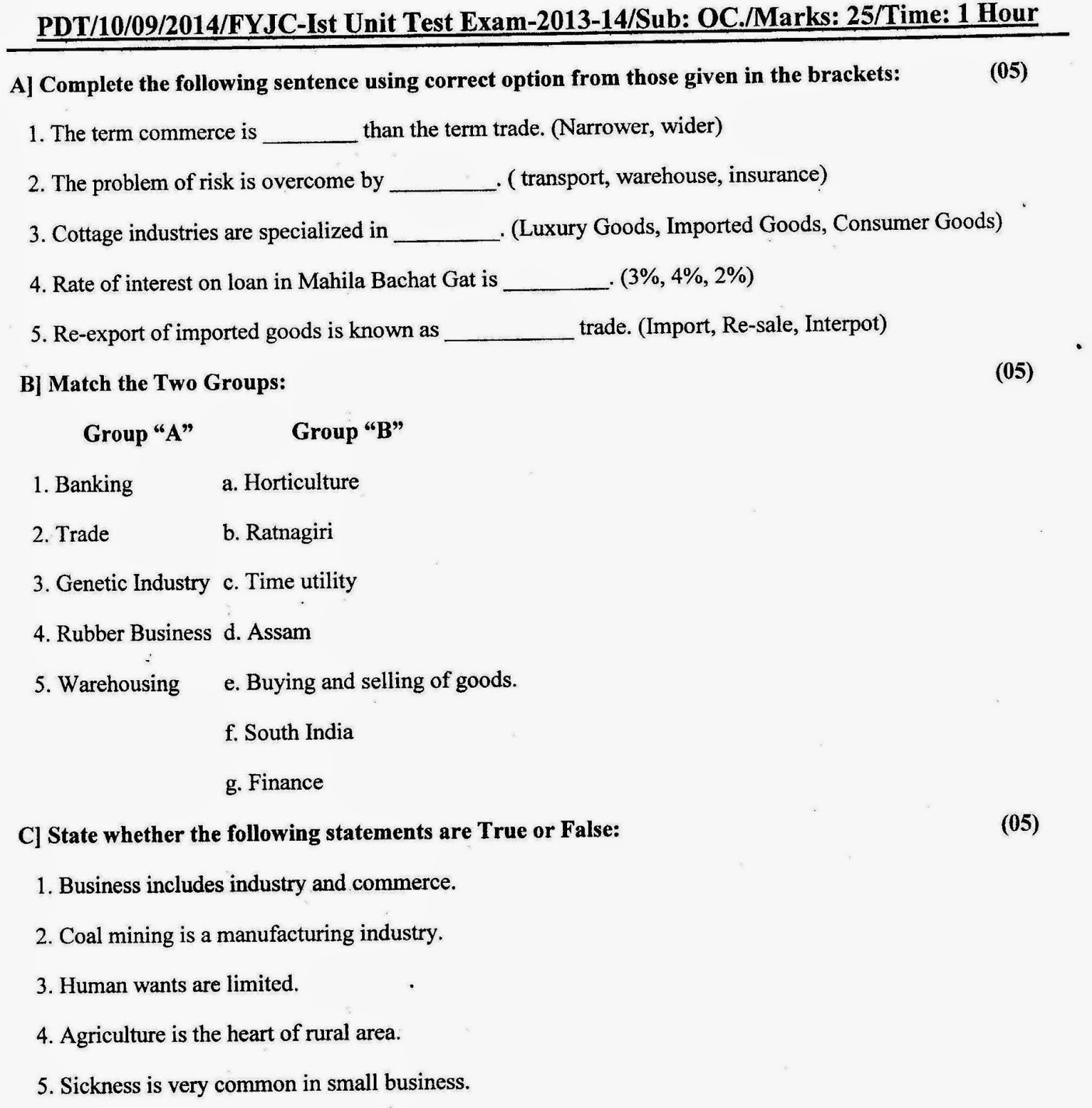 F.Y.J.C. Commerce 1st UNIT TEST, SEPTEMBER 2014
